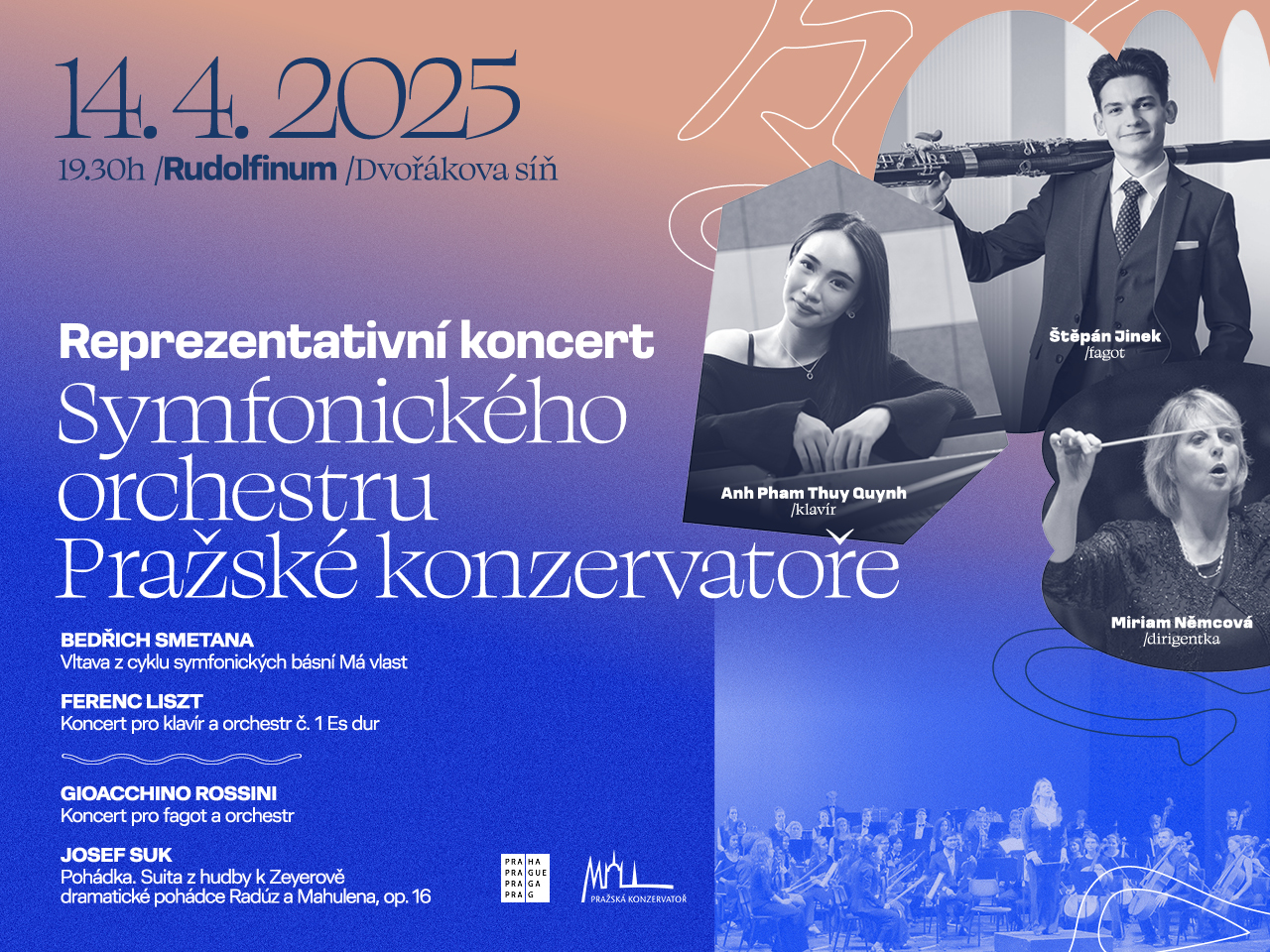 “The Symphony Orchestra of the Prague Conservatoire is preparing a representative concert in the Dvořák Hall of the neighbouring Rudolfinum. Pianist Anh Pham Quynh and bassoonist Štěpán Jinek will appear as soloists. On 14 April, the ensemble will be conducted by its director, Miriam Němcová.”